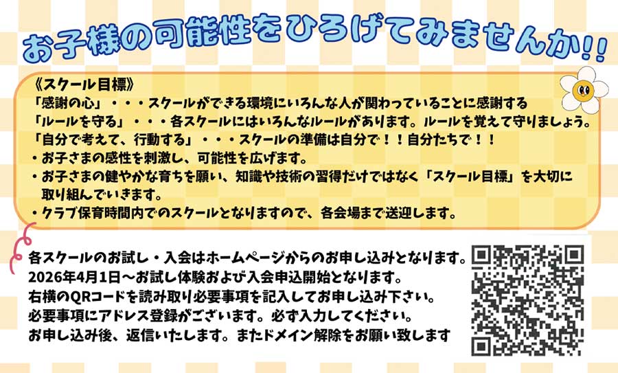 体験の1週間前までにお申し込み下さい! 体験申し込み【電話の方】 J(ジェイ)キッズスクールTEL:090-5685-2030 一般社団法人 J(ジェイ)キッズ事務局TEL:080-1955-5151(直通) メールでのお問合せ 保護者様氏名 【必須】 メールアドレス 【必須】 お電話番号 【必須】 児童氏名 【必須】 ふりがな 【必須】 学年 【必須】 児童氏名2【任意】 ふりがな 学年2【任意】 所属クラブ 【必須】 ジョイ、スカイ、アクア・キッズちよのかもめ、つばめ・キッズあさひマーブル、エイブル、トリプル、カラフル・キッズとうめいコスモ・キッズたちの ののいち 個人情報の取扱いについて、同意の上送信します。 ※体験日のお問い合わせはスクールまでお願い致します。 Δ